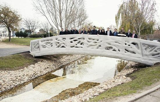 世界上第一座3D打印橋幾天前在西班牙首都馬德里市的一座城市公園里揭幕。為了打造這座3D打印橋梁,研究人員們歷經(jīng)了15年的不斷試驗,終于在建筑家、工程師以及城市代表的合力幫助下,將草圖變成現(xiàn)實。該橋長12米,寬1.75米,由微提純混凝土打造。