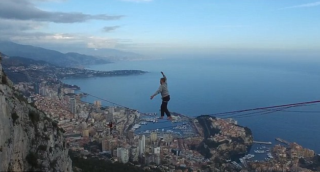 人們常說勇敢和愚蠢就在一線之間。這群在摩納哥高空中的“玩命之徒”可能就走在這條線上。據(jù)悉,這群冒險(xiǎn)者將尼龍帶固定在兩個支點(diǎn)上,行走于兩個懸崖之間。這種運(yùn)動被稱為Slacklining(走軟繩),與走鋼絲有些相似。