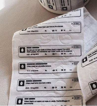 作為一名時(shí)尚博主,有人擁躉也會(huì)有人毀謗。一位意大利女模特兼時(shí)尚博主想出了一個(gè)妙招來(lái)羞辱在網(wǎng)絡(luò)上對(duì)她進(jìn)行惡意抨擊的網(wǎng)友——將他們的評(píng)論印在廁紙上,這一舉動(dòng)讓這位漂亮的女模特在網(wǎng)上大火了一把。
