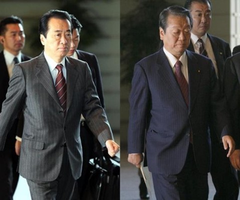 走進(jìn)日本首相官邸的菅直人(左)和小澤一郎(右)(資料圖)