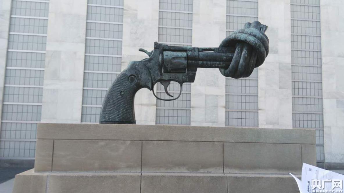聯(lián)合國(guó)大樓內(nèi)外有各成員國(guó)送的藝術(shù)品禮物,這是著名的“打結(jié)的手槍”,安放在聯(lián)合國(guó)花園內(nèi),1988年盧森堡送給聯(lián)合國(guó)。(記者朱敏 攝)