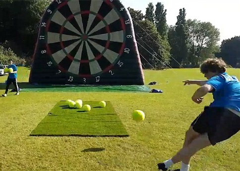 聽過踢足球,聽說過踢高爾夫,沒聽說過“飛鏢足球”?近日,英國腳體育運動的粉絲們創(chuàng)新了一種新式腳下運動,將飛鏢與足球混搭——將足球踢向巨型充氣圓靶目標(biāo),引起了人們關(guān)注。