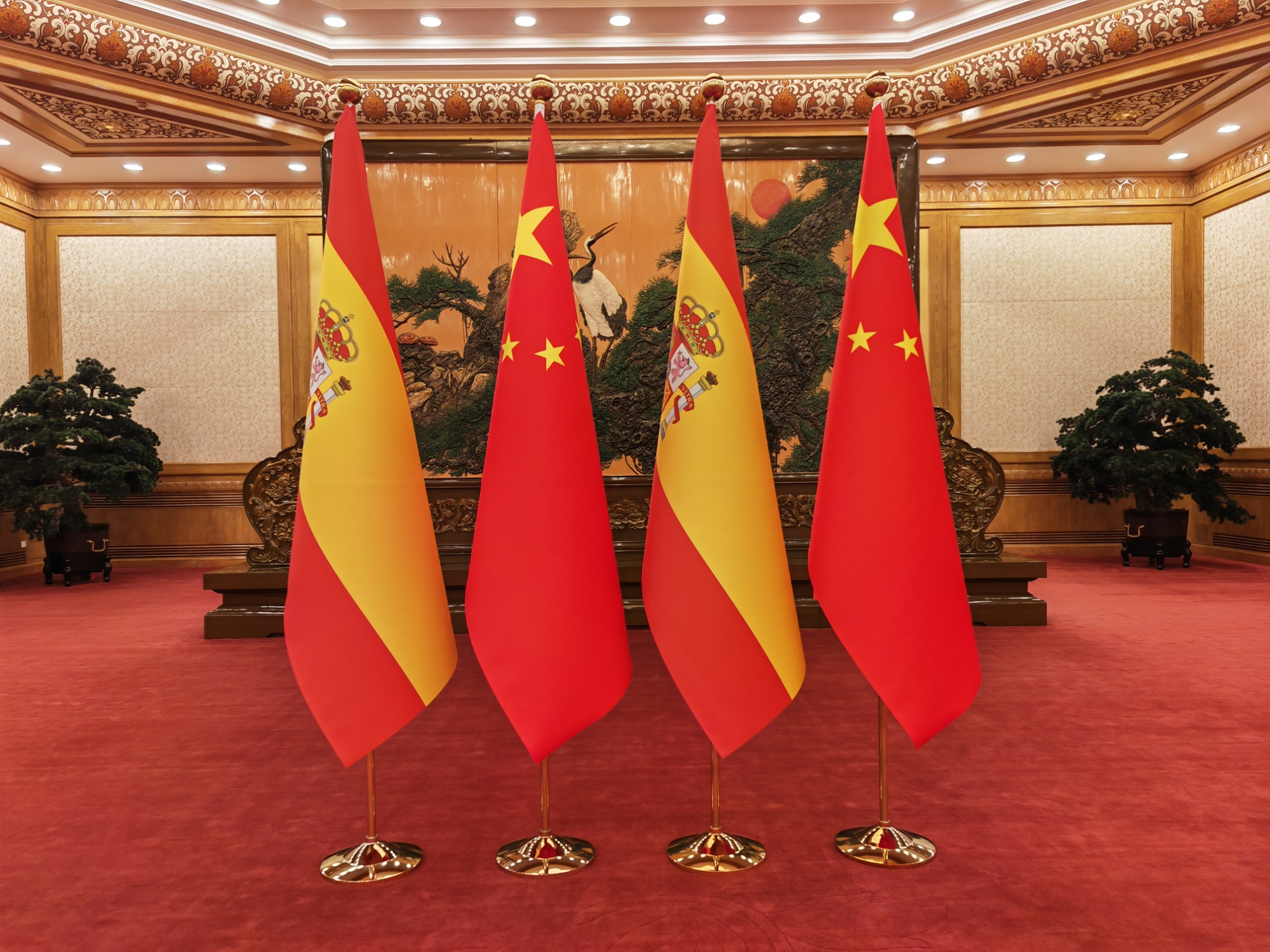 2025年11月12日,北京人民大會堂擺放的中國和西班牙兩國國旗(總臺記者馬喆 攝)