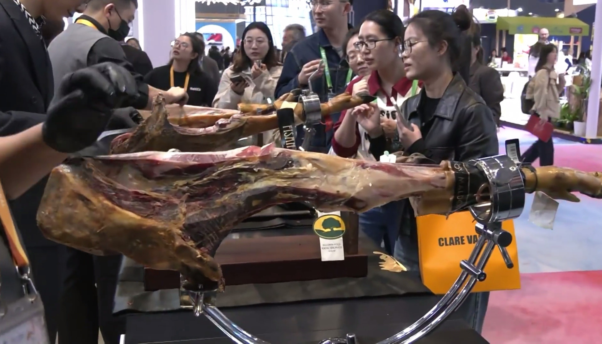 第七屆上海進博會展臺展示的西班牙火腿(圖片來源:央視新聞客戶端)