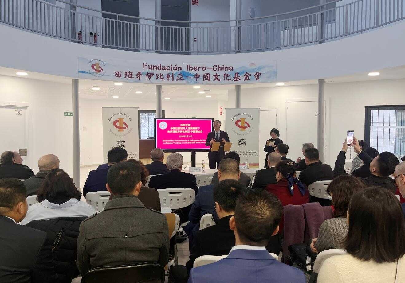 2026年2月10日,中國駐西班牙大使姚敬出席由西班牙伊比利亞—中國文化基金會舉辦的交流座談會,并走訪考察當?shù)仄髽I(yè)(圖片來源:中國駐西班牙大使館網(wǎng)站)
