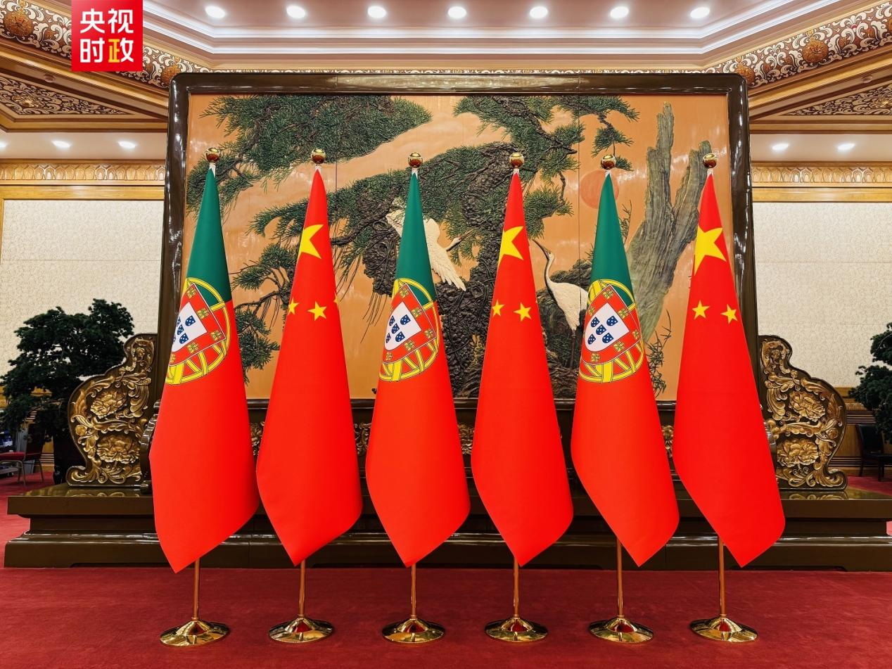 2025年9月9日,在北京人民大會堂擺放的中葡兩國國旗(圖片來源:央視新聞客戶端)
