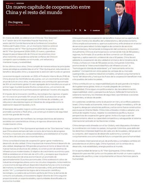 2026年3月25日,駐哥倫比亞大使朱京陽在哥《共和國報》發(fā)表署名文章《書寫中國與世界互利共贏的新篇章》