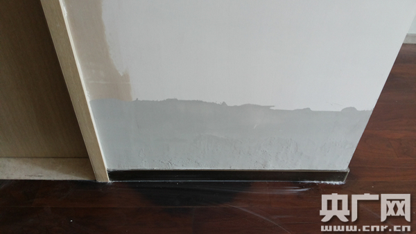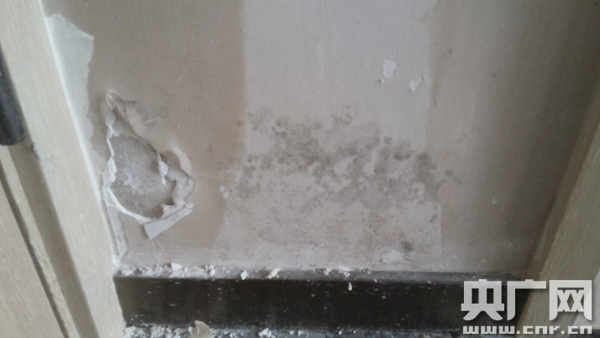業(yè)主包欣(化名):我們家的墻面、地角線發(fā)霉,交房的當天就發(fā)霉了。然后換了,換了以后都再看一看,結(jié)果那邊又發(fā)霉了,不僅僅是地腳線,連地板都在發(fā)霉。