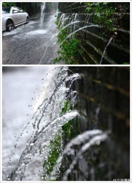 網(wǎng)上熱傳的照片顯示,在太平門以東龍脖子路的那段明城墻,距離地面1米多的位置,出現(xiàn)幾十個水柱,大量雨水從城墻內(nèi)部通過縫隙排出。而在距離地面四五米處,墻體上還有兩個大型的青石吐水槽,吐出兩條更大的水柱。