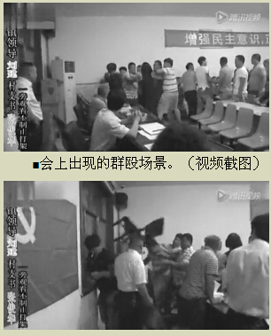 現(xiàn)場(chǎng)視頻可見(jiàn),坐在詹俊東右邊隔著一個(gè)人的村支書(shū)張俊華伸手要把話(huà)筒拿回來(lái),被詹俊東拒絕,兩個(gè)人開(kāi)始爭(zhēng)吵。臺(tái)下有村民和詹俊東的女兒分別上前幫手,爭(zhēng)吵中爆發(fā)出粗口,并開(kāi)始抓扯爭(zhēng)搶麥克風(fēng)。詹俊東的女兒將麥克風(fēng)扔出,砸碎玻璃,之后推搡一名男子,再抓起桌上的物品扔向另一名男子,隨后,她也被對(duì)方推倒在地。雙方多人加入,互相抓扯,有人舉起木質(zhì)座椅砸向?qū)Ψ健;靵y持續(xù)大約3分鐘。