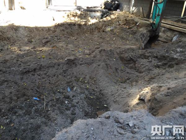 記者今天下午來到這里,一臺挖掘機停在該院東門口,墻上已經(jīng)貼有北京市東城城管的舉報熱線。私挖分兩個部分,一是四間平房的下挖,已被挖出最深處達2.1米,共計153平米的地下空間;二是院內(nèi)的下挖,深坑達165平米,深度已超過1米。東城城管等部門已經(jīng)組織人員對該地下空間進行強制回填,今天下午,記者看到平房地上鋪著剛剛凝固的水泥,平房的回填工作已經(jīng)完成。院內(nèi)的大坑仍有一米多深,尚等待繼續(xù)回填。