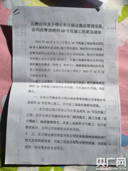 五洲公司關(guān)于停止東方順達酒店集團有限公司在青龍胡同10號院施工的緊急通知