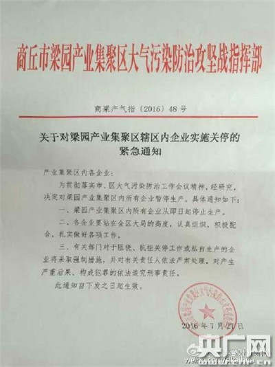 記者了解到,不少企業(yè)也被要求停產(chǎn)了。比如商丘梁園區(qū)就專門發(fā)出緊急通知,要求其產(chǎn)業(yè)集聚區(qū)內(nèi)所有企業(yè)暫停生產(chǎn)。這份本月27日發(fā)出的紅頭文件稱,是為了貫徹落實(shí)省市大氣污染防治工作會(huì)議,要求各企業(yè),站在全區(qū)的高度,積極配合,如果有企業(yè)阻撓,抗拒關(guān)停工作或私自生產(chǎn),將會(huì)采取強(qiáng)制措施。