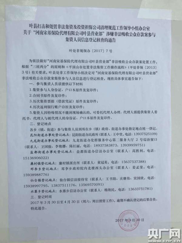 今年3月30日,葉縣打擊和處置非法集資以投資擔保公司清理規(guī)范工作領導小組辦公室發(fā)文,對“河南宋基保險代理有限公司葉縣營業(yè)部”“非法吸收公眾存款案”集資參與人員進行信息統(tǒng)計,登記工作已經(jīng)于4月30日完成。
