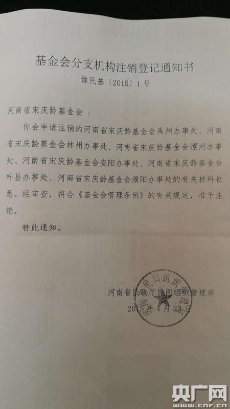 河南省宋慶齡基金會葉縣辦事處在2015年4月23日注銷