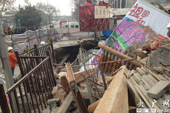周六凌晨,德勝門內(nèi)大街93號,門前突然發(fā)生坍塌。出現(xiàn)長15米、寬5米、深10米大坑。當(dāng)天中午,該民宅北側(cè)4間房屋倒塌,倒塌面積約54平米。塌陷不僅危及路面,還殃及了附近幾戶的平房。周邊四戶共15人暫時離開房屋,被安置在賓館。