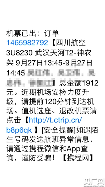 北京的張女士計劃在中秋節(jié)這一天從武漢趕到湖北神農(nóng)架游玩,她9月6日就在攜程旅行網(wǎng)訂好了機(jī)票,攜程還給張女士發(fā)來了確認(rèn)信息,確認(rèn)9月27日四川航空3U8230武漢天河T2—神農(nóng)架,13點45起飛,還提醒“近期因機(jī)場安檢力度升級,請?zhí)崆?20分鐘到達(dá)機(jī)場”,并發(fā)來了選座鏈接,可張女士昨天中午到了機(jī)場辦手續(xù)時才知道航班取消了。