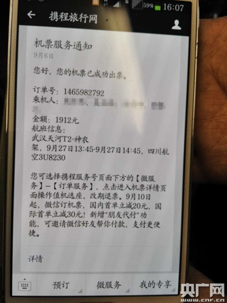 這個尾號1698 的手機(jī),并不是張女士的手機(jī)號碼,記者多次撥打無法接通。那么,航空公司提前一周給誰發(fā)了信息?責(zé)任在誰?在記者再次致電攜程旅行網(wǎng),記者亮明了身份,在半個小時的通話后,攜程方面終于給了回復(fù),這個號碼是攜程合作方的,是出票方票臺的電話。