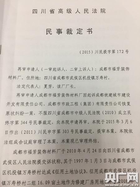 夏芳說:“2010年就開始起訴市統(tǒng)建辦,武侯區(qū)法院沒有受理,說我的土地被征收了。7月份拿到裁定之后,我馬上去市中院,但中院也維持了武侯區(qū)法院的裁定,沒有立案,告訴我是和省政府的拆遷文件有關(guān)。”