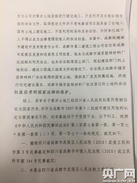 夏芳又向四川省高院提出了再審申請。高院的裁定書顯示,四川省政府此次同意征收的八塊土地均為農(nóng)村集體土地,并不涉及國有土地以及夏芳的廠房所在地塊。四川省高院裁定,成都市統(tǒng)建辦、成都市第二建筑公司非法侵占了夏芳廠房合法取得的國有土地,成都市統(tǒng)建辦將夏芳土地納入城中村改造項目,歪曲了四川省政府文件規(guī)定的征地對象以及適用范圍。