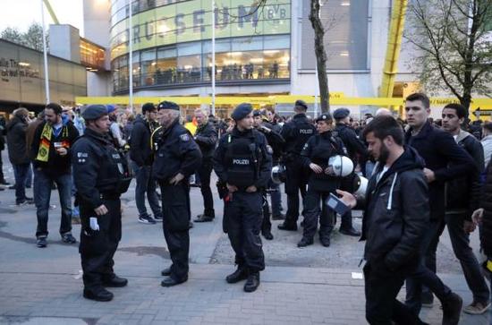 當(dāng)?shù)貢r(shí)間4月11日,警察在多特蒙德隊(duì)足球場外警戒。