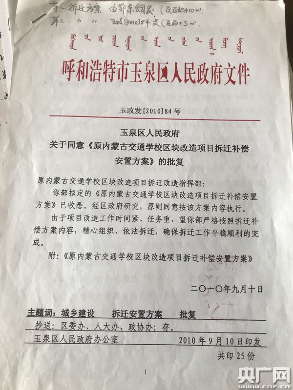 2010年9月,呼和浩特市玉泉區(qū)政府批復(fù)同意了對(duì)這一區(qū)塊的拆遷補(bǔ)償安置方案。78歲的張孝榮老人和84歲的姜明久老人說,當(dāng)初拆遷時(shí),他們積極配合,但至今還住在開發(fā)商提供的過渡房里。