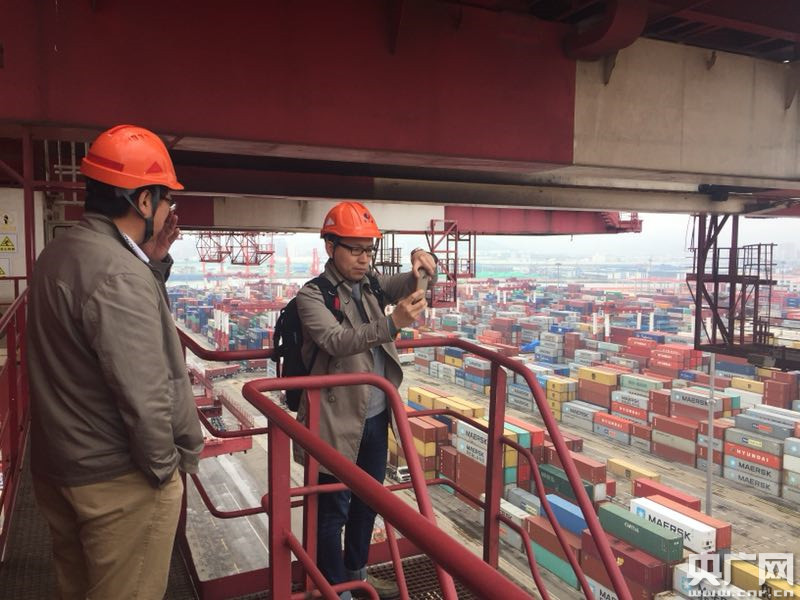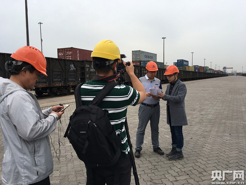 央廣記者柴安東(右一)、央視攝像趙迎晨(左二)在采訪陸橋國(guó)際貨運(yùn)代理有限公司報(bào)關(guān)中心經(jīng)理王欣(右二)