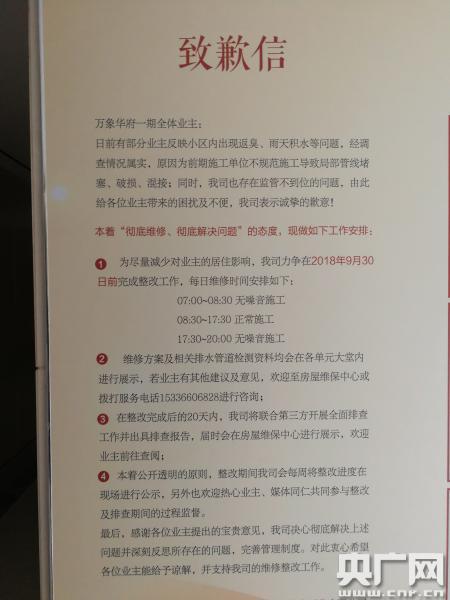 圖為開發(fā)商的致歉信。(央廣網(wǎng)記者 杜金明 攝)