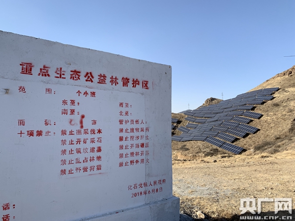 在阜新蒙古族自治縣化石戈鄉(xiāng)西二色村附近,記者看到,2018年6月8日剛立起來的“重點(diǎn)生態(tài)公益林管護(hù)區(qū)”公示牌背后,不是大片的林地,而是黑壓壓的光伏面板,光伏板下一個(gè)個(gè)的樹坑仿佛告訴著人們,這里本該是一片林地。