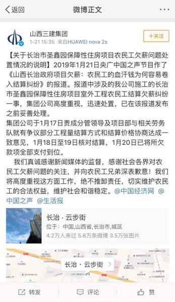 1月21日下午,該項(xiàng)目的施工單位山西三建集團(tuán)在其官方微博發(fā)布情況說明稱,集團(tuán)公司對結(jié)算欠薪糾紛一事,高度重視,迅速處置,已在媒體報道發(fā)布之前妥善處理。集團(tuán)公司1月20日已將所欠款項(xiàng)全部支付到位。情況說明還表示,向農(nóng)民工兄弟深表歉意,將高度重視這方面工作,絕不推卸責(zé)任,切實(shí)維護(hù)農(nóng)民工的合法權(quán)益。
