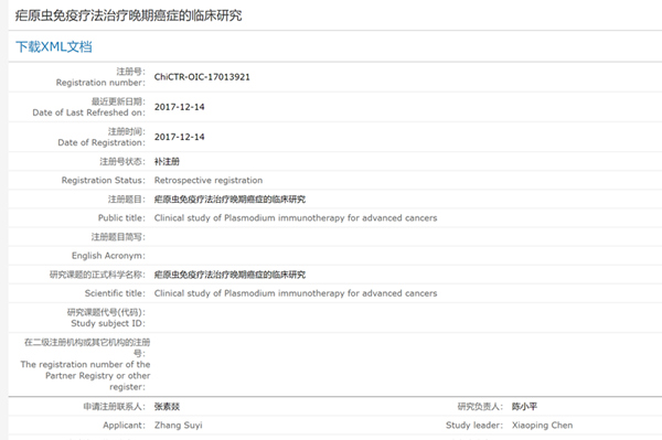 中國臨床試驗(yàn)注冊中心“瘧原蟲免疫療法治療晚期癌癥的臨床研究”相關(guān)數(shù)據(jù)截圖