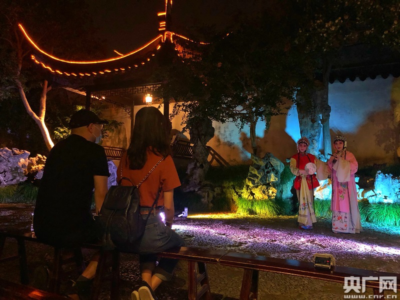 兩名游客在網(wǎng)師園夜游活動中觀看昆曲《游園》片段(中央廣播電視總臺央廣記者 白杰戈 攝)
