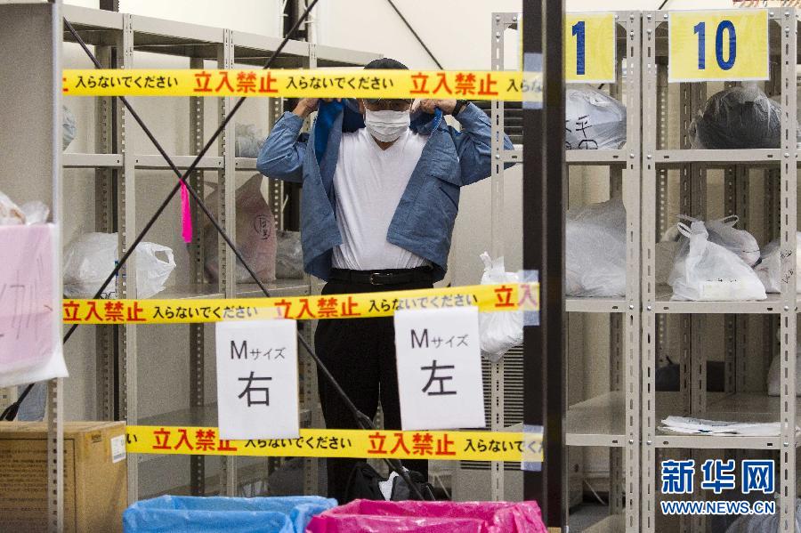 11月11日,工作人員在日本福島縣的中轉(zhuǎn)場所“J Village”內(nèi)換衣服。新華網(wǎng)發(fā)