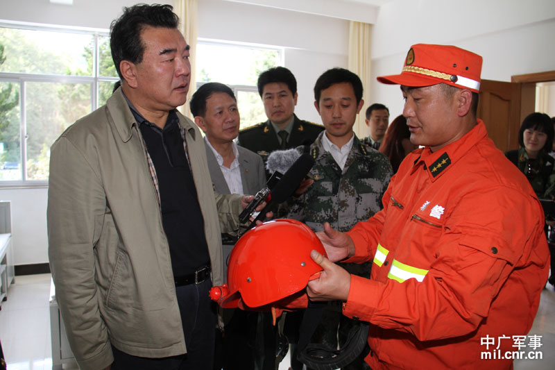 武警云南森林總隊騰沖中隊指導(dǎo)員向記者團介紹滅火作戰(zhàn)服 中廣軍事記者劉鵬攝