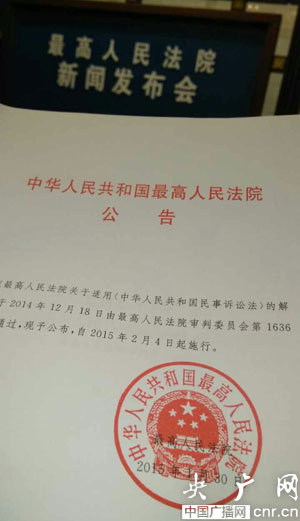 央廣網(wǎng)北京2月4日消息(記者孫瑩)據(jù)中國之聲《央廣新聞》報(bào)道,新修改的《民訴法》2013年1月1日起施行,修改條文近100處,是我國民主法制建設(shè)的重大立法成果。最高人民法院今天(4日)上午正式發(fā)布新的《關(guān)于適用<中華人民共和國民事訴訟法>的解釋》,對法院適用民事訴訟法的相關(guān)問題作了全面系統(tǒng)、明確具體的規(guī)定。最高法召開新聞發(fā)布會,對這部司法解釋進(jìn)行解讀。