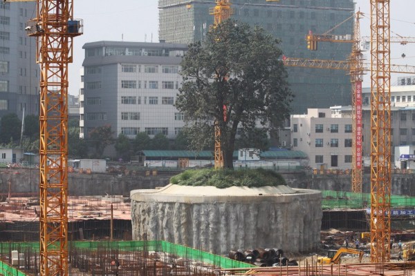在項目現(xiàn)場,方圓130畝的工地上,中間有一方的土丘上,立著一棵20多米高的古樹,非常顯眼。據(jù)介紹,這棵楸樹已有300多歲。據(jù)相關資料,楸樹是我國珍貴的用材樹種之一,它的材質(zhì)好、用途廣、經(jīng)濟價值高,居百木之首。據(jù)現(xiàn)場負責施工的張立志司理介紹,在開發(fā)過程中,為了維護這棵楸樹,樊城區(qū)政府延聘專家到現(xiàn)場考察,決定在楸樹的外圍打樁、澆筑水泥、植草,防止水土流失。挖了20多米,打了91根保護樁,總共花費400多萬元才固定下來,而且把保護區(qū)占地擴大到近3000平方米,在這塊區(qū)域地下不建停車場。