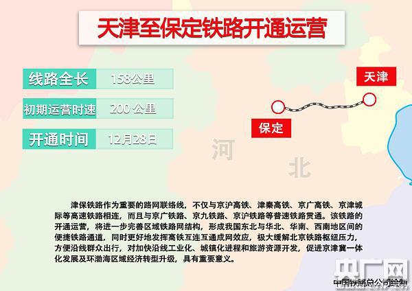 記者從中國鐵路總公司獲悉,12月28日,天津至保定鐵路(俗稱津保鐵路)開通運(yùn)營,天津到保定的運(yùn)行時(shí)間將由原來的最快2小時(shí)36分壓縮至1小時(shí)左右,東北到華北、華南、西南地區(qū)間的運(yùn)行時(shí)間也將大幅度壓縮。