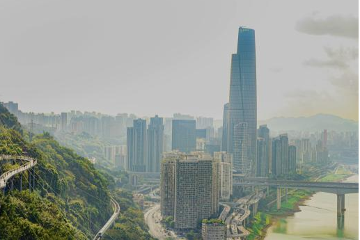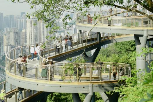 半山崖線鵝嶺段,懸空棧道蜿蜒于林間,螺旋式平臺錯落有致。陽光透過枝葉灑下斑駁光影,游人駐足拍照,一邊是青山疊翠,一邊是長江奔流、高樓林立,輕軌列車穿行于江景之間,山城立體之美盡收眼底。