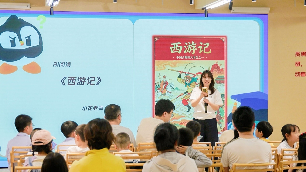 活動(dòng)現(xiàn)場(chǎng)設(shè)置AI通識(shí)課,孩子們通過互動(dòng)體驗(yàn)生成童話故事、繪制個(gè)性化畫像,近距離感受人工智能應(yīng)用。在科技伴讀環(huán)節(jié),大家借助“企鵝讀伴”小程序閱讀《西游記》,通過AI聲音復(fù)刻聆聽父母朗讀的故事,提升閱讀興趣的同時(shí),緩解陪伴缺失帶來(lái)的孤單感。