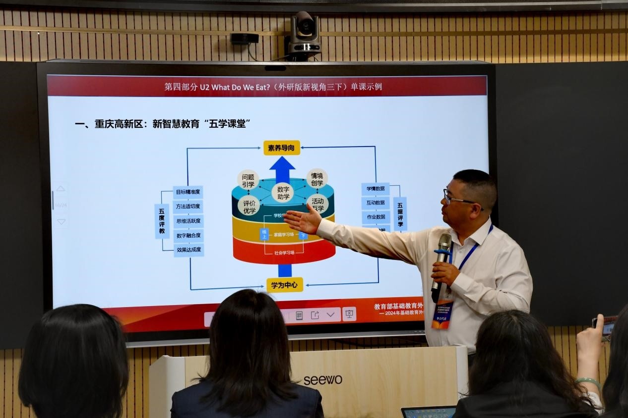 在本次教育部基礎(chǔ)外語教學優(yōu)秀典型案例展播中,重慶高新區(qū)教育事務(wù)中心教研室國際交流部主任、英語教研員張云建,重慶科學城南開景陽小學教師陳冰茜做了題為《指向核心素養(yǎng)發(fā)展的單元整體教學與持續(xù)性評價的設(shè)計與實施》的發(fā)言。據(jù)張云建介紹,在單元整體教學探索中,重慶高新區(qū)小學英語團隊以“大觀念”為理論引領(lǐng),以“五學課堂”(問題引學、情境創(chuàng)學、活動互學、評價優(yōu)學、數(shù)字助學)為實施路徑,圍繞學生核心素養(yǎng)發(fā)展目標開展教學實踐。二者深度融合,體現(xiàn)了教育哲學與教學實踐的協(xié)同共進—“大觀念”錨定育人方向與價值內(nèi)涵,“五學課堂”提供結(jié)構(gòu)化操作框架。