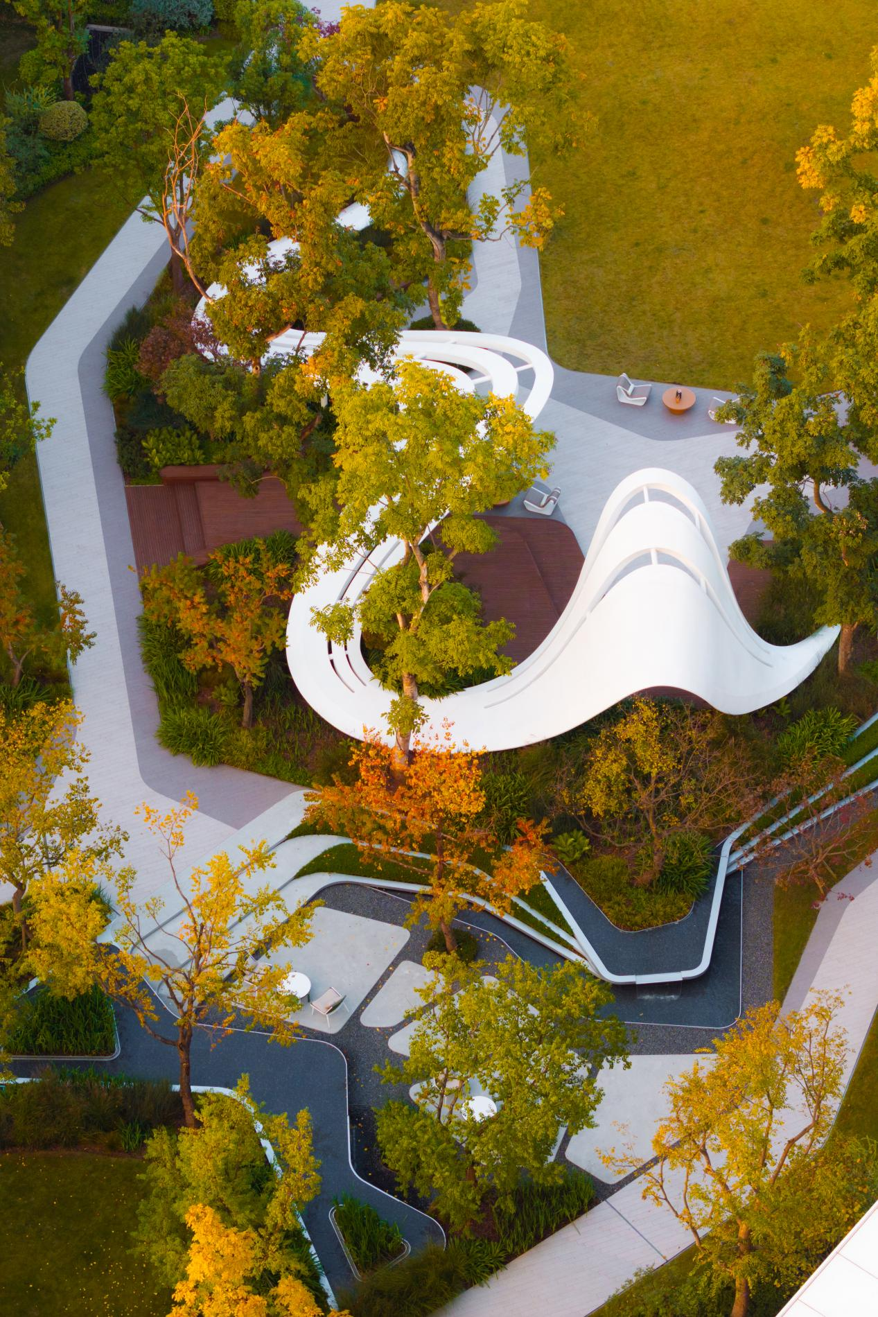 整個(gè)項(xiàng)目將坡地林谷被最大限度地保留,將園區(qū)內(nèi)180種植物融入其中,構(gòu)成一個(gè)層次豐富、生機(jī)盎然的生態(tài)系統(tǒng)。結(jié)合山城特色,以原生28米高差為基,建筑依山就勢(shì),錯(cuò)落有致,實(shí)現(xiàn)建筑與地形的共生共舞。這一“順勢(shì)而為”的智慧規(guī)劃哲學(xué),將“山林森居”理念貫穿始終,使社區(qū)真正從自然中生長(zhǎng)出來(lái)。