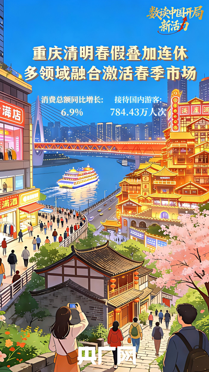 重慶市商務(wù)委的數(shù)據(jù)統(tǒng)計顯示,春日場景與文旅體驗深度融合,持續(xù)釋放消費新活力。清明期間,全市接待國內(nèi)游客784.43萬人次,同比增長5.1%;國內(nèi)旅游花費72.20億元,同比增長11.7%,人均花費926.79元,同比增長6.2%。