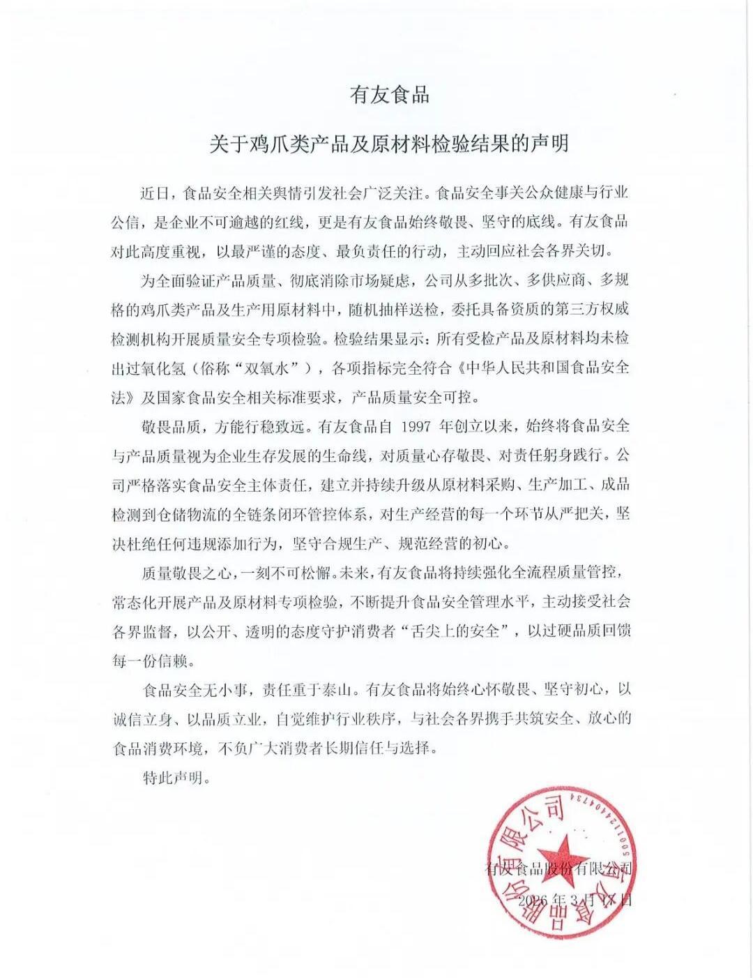 3月17日,有友食品再次發(fā)表聲明稱,該企業(yè)始終將食品安全與產(chǎn)品質(zhì)量視為企業(yè)生存發(fā)展的生命線,建立并持續(xù)升級從原材料采購、生產(chǎn)加工、成品檢測,倉儲物流到全鏈條閉環(huán)管控體系。未來,有友食品將持續(xù)強化全流程質(zhì)量管控,常態(tài)化開展產(chǎn)品及原材料專項檢驗,不斷提升食品安全管理水平,主動接受社會各界監(jiān)督,以公開、透明的態(tài)度守護消費者“舌尖上的安全”,以過硬品質(zhì)回饋每一份信賴。