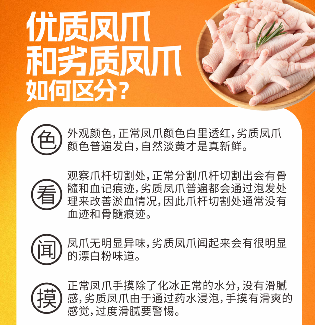 同時,他們還給了消費者購買“放心爪”的安心避坑指南,通過四招識別優(yōu)質(zhì)鳳爪與劣質(zhì)鳳爪,讓市民明明白白消費。首先是色,正常鳳爪顏色白里透紅,劣質(zhì)鳳爪顏色普遍發(fā)白,自然淡黃才是真新鮮;其次看,看爪桿切割處,正常分割爪桿處會有骨髓和血跡,劣質(zhì)鳳爪通過泡發(fā)處理,切割處通常沒有血跡和骨髓痕跡;再次,聞,正常鳳爪聞起來無明顯異味,而劣質(zhì)鳳爪聞起來有很明顯的漂白粉味道;最后是摸,正常鳳爪除了化冰水分,沒有滑膩感,而劣質(zhì)鳳爪通過藥水浸泡,手摸有滑爽的感覺,過度滑膩要警惕。