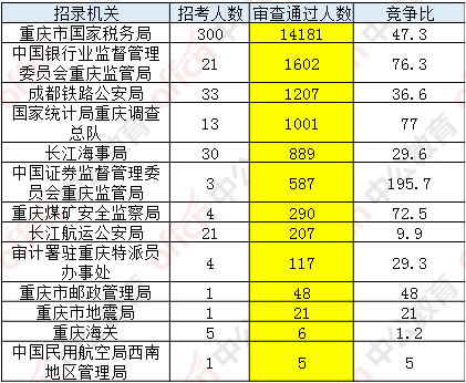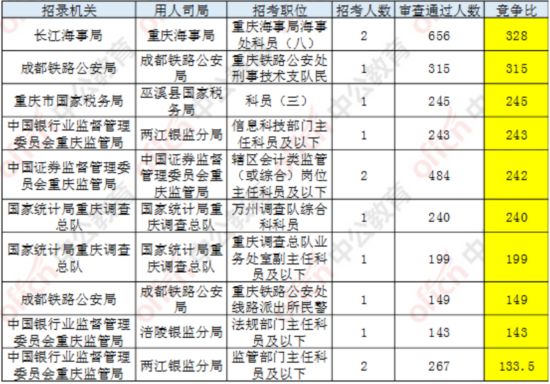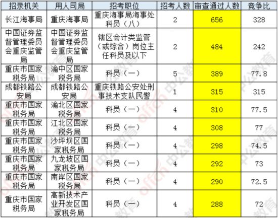 報(bào)名通過審核人數(shù)前十的職位主要集中在長江海事局、中國證券監(jiān)督管理委員會重慶監(jiān)管局、重慶市國家稅務(wù)局、成都鐵路公安局四個部門。報(bào)名通過審核人數(shù)最多的職位亦是競爭比例最高的職位。