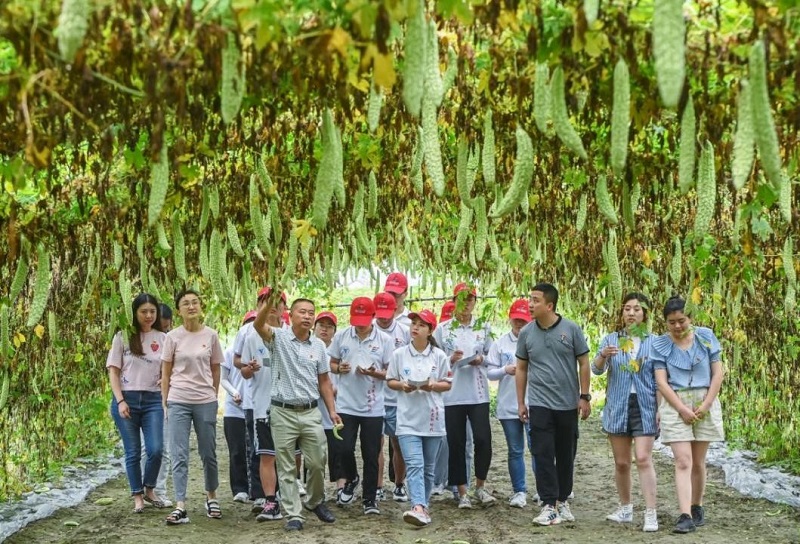 在蔬菜大棚里,朱支書給同學(xué)們講解當(dāng)季的苦瓜種植過(guò)程,并重點(diǎn)介紹了農(nóng)藥和廢舊地膜的處理,每一個(gè)環(huán)節(jié)都踐行著“綠色”發(fā)展理念。通過(guò)朱支書的講解,志愿者們紛紛表示:“這堂田間地頭的思政課,講到了我們心坎里,聚焦我們?nèi)绾螌褌(gè)人的理想追求融入黨和國(guó)家事業(yè)之中,讓青春之花綻放在祖國(guó)最需要的地方。”最后,朱書記號(hào)召志愿者們:“永遠(yuǎn)跟黨走,學(xué)好專業(yè)技術(shù)到基層來(lái),做鄉(xiāng)村振興急需的人才!