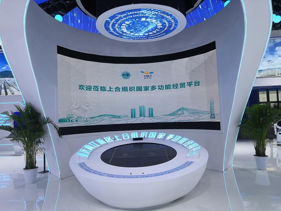 步入展館內(nèi)部,映入眼簾的則是“兩江新區(qū).上合組織國家多功能平臺(tái)”。用手輕輕滑動(dòng)電子屏翻頁鍵,可一覽兩江新區(qū)與上合組織國家的經(jīng)貿(mào)往來、合作成效。