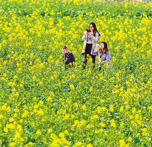 2月12日,市民在南川區(qū)東城街道三秀社區(qū)萬畝油菜花田里游玩。當日,春光明媚,次第盛開的油菜花吸引市民走出家門,追逐春天的腳步。特約攝影 瞿明斌