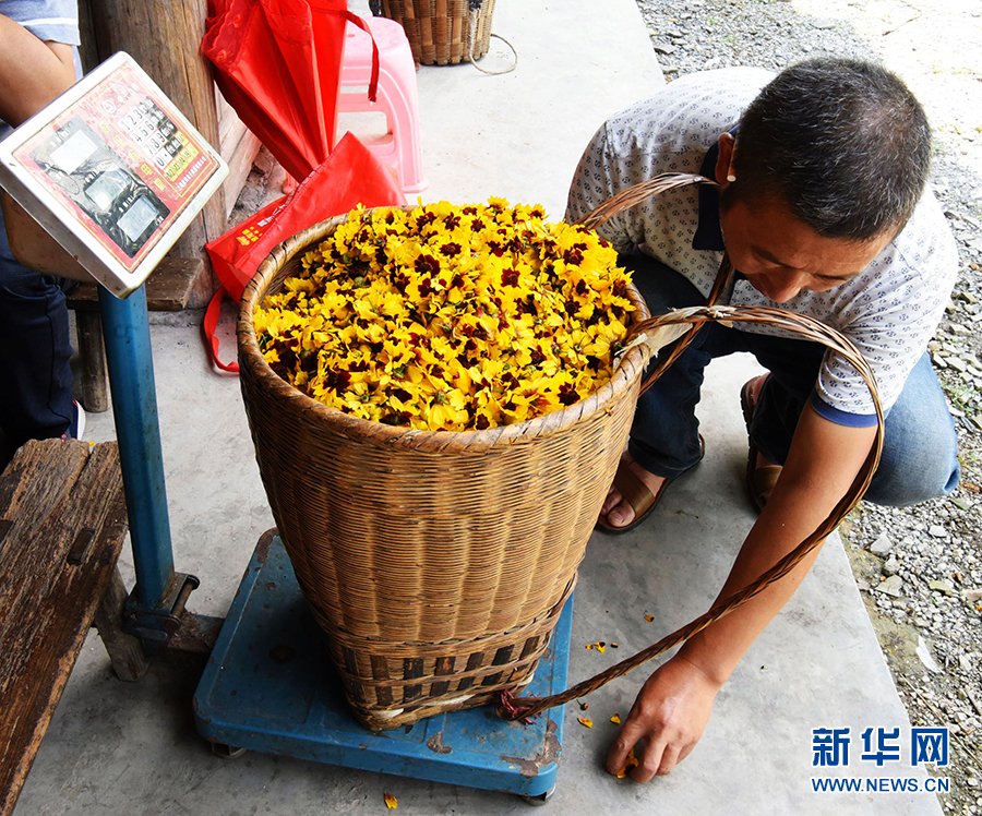 圖為村民過(guò)秤干花。據(jù)介紹,天山雪菊目前干花價(jià)格300元/斤,按畝產(chǎn)120公斤計(jì)算,除去種子錢(qián)、耕地費(fèi)、滴管材料費(fèi)和人工費(fèi)等,每畝收入在5000元左右。新華網(wǎng)發(fā)(陳碧生 攝)