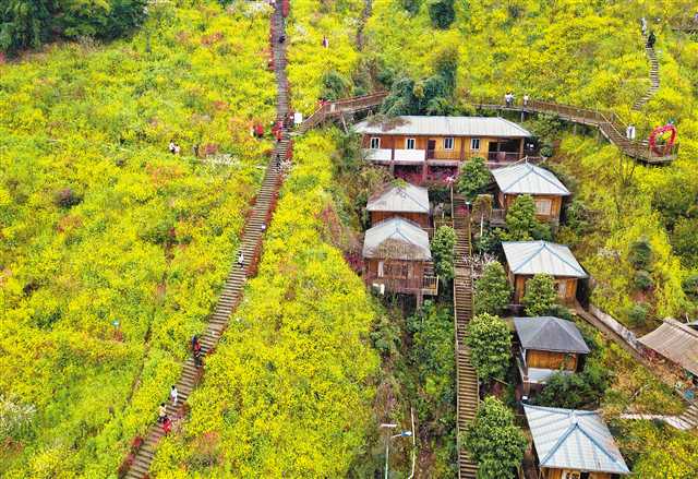 穿過厚廬不遠(yuǎn),就是第三步道的著名“打卡”點(diǎn)——木制棧道。鵝黃色的棧道,凌空而建,如同天空之城,大量游客停下拍照游覽,將此堵得水泄不通。
